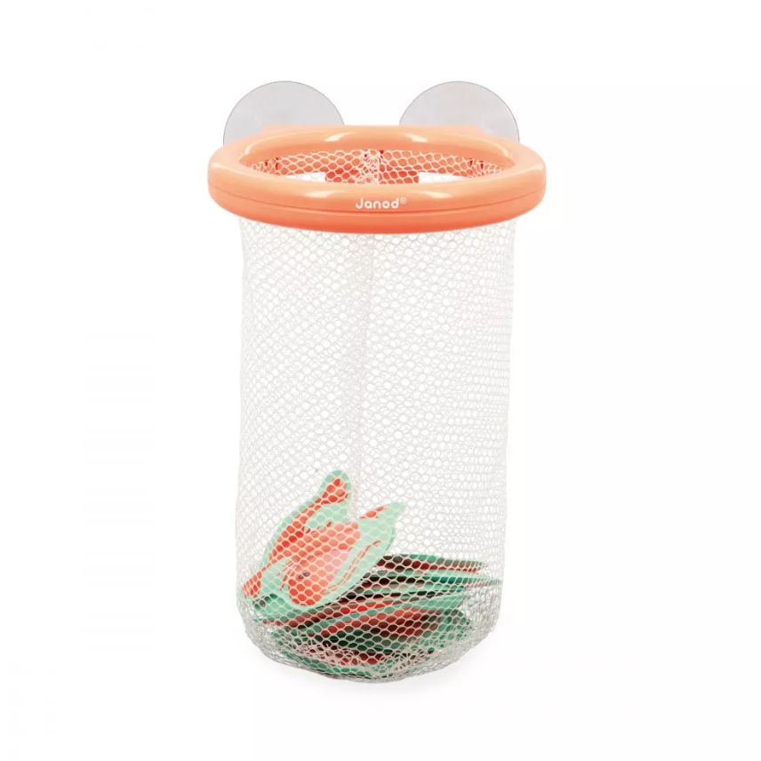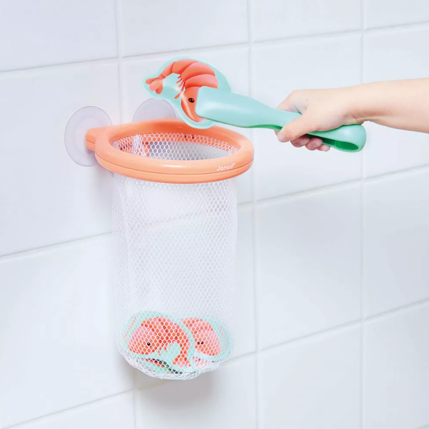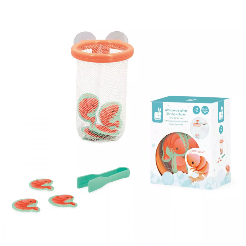 Er zijn 12 kleine garnalen in het bad ontsnapt, vang ze snel! Het kind kan elke garnaal die op het wateroppervlak drijft vangen met de tang en in de leuke mand plaatsen, die dankzij de zuignappen aan de wand van het bad kan worden bevestigd. Met dit spel kan uw kind zijn behendigheid ontwikkelen terwijl hij of zij een leuke tijd in het bad beleeft. Badspeelgoed voor kinderen vanaf 2 jaar.