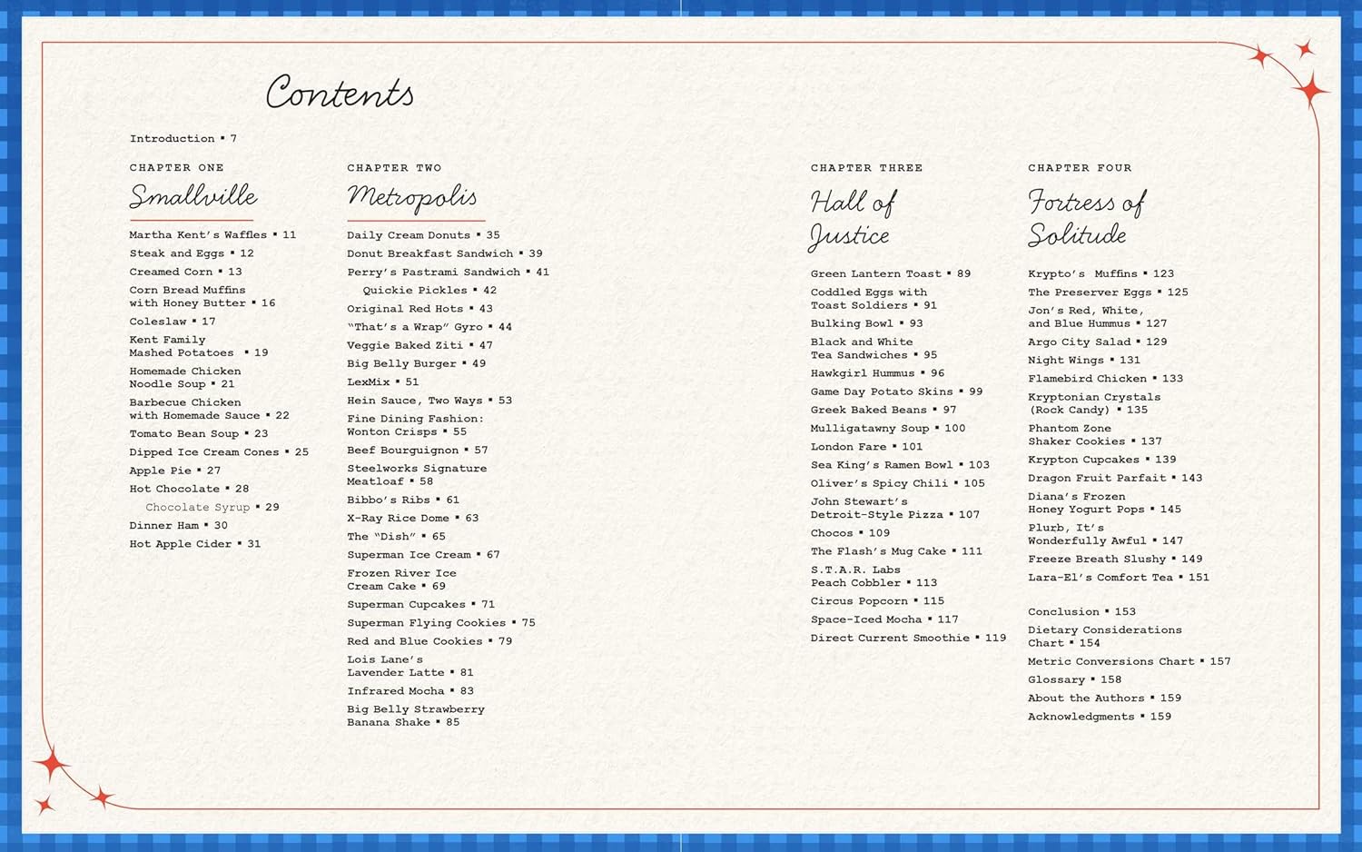 Continuing a Kent Family tradition, Martha has put together an heirloom cookbook full of Clark’s favorite dishes… with help from his friends and colleagues, of course. Together, they’ve recreated the beef bourguignon and ketchup from Clark and Lois’s first date, Cyborg’s lucky game day potato skins, and J’onn’s Chocos. Martha’s even recreated Plurb, which she hears is wonderfully awful. She wasn’t quite ready to taste that one herself.