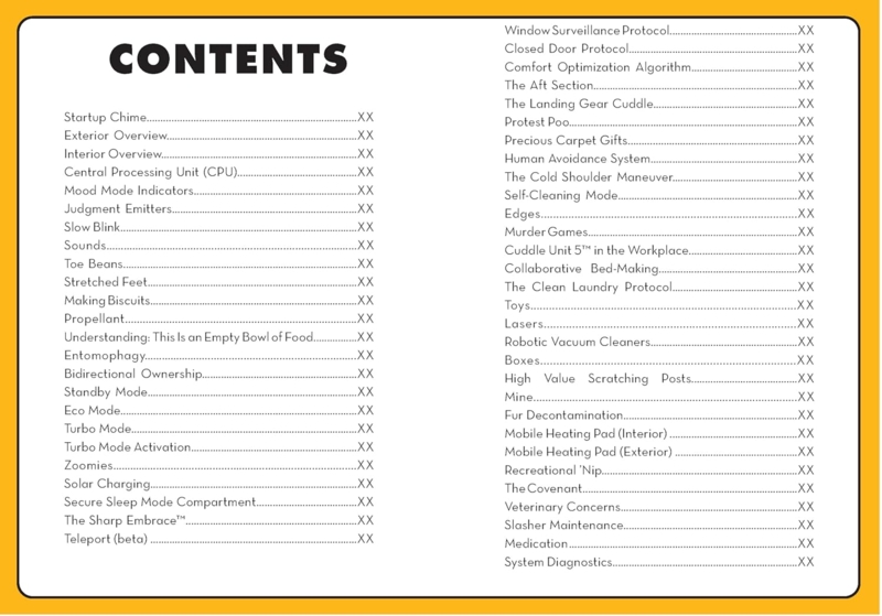The Cat Operator's Manual is a fresh and quirky guide to understanding your cat, complete with assembly, warnings, insights into all of your Cuddle Units features and modes, and a bonus sticker sheet. We recommend that you read these operating instructions thoroughly to quickly become acquainted with your Cuddle Unit and enjoy all of its features.