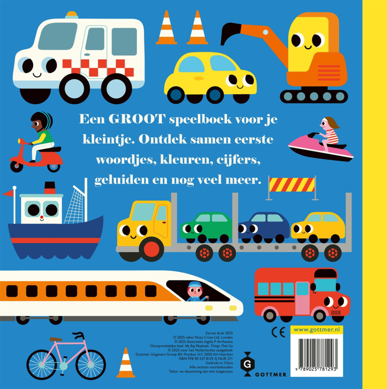 'Mijn grote speelboek Voertuigen' is een groot kartonboek met daarin alles wat dreumesen en peuters nodig hebben om de wereld om zich heen te kunnen ontdekken: eerste woordjes, kleuren, cijfers en meer! Het staat vol stoere voertuigen, van raceauto tot vorkheftruck. Hoeveel fietsen kun jij tellen? Welke kleur heeft de brandweerwagen? En welk geluid maakt de stoomtrein?