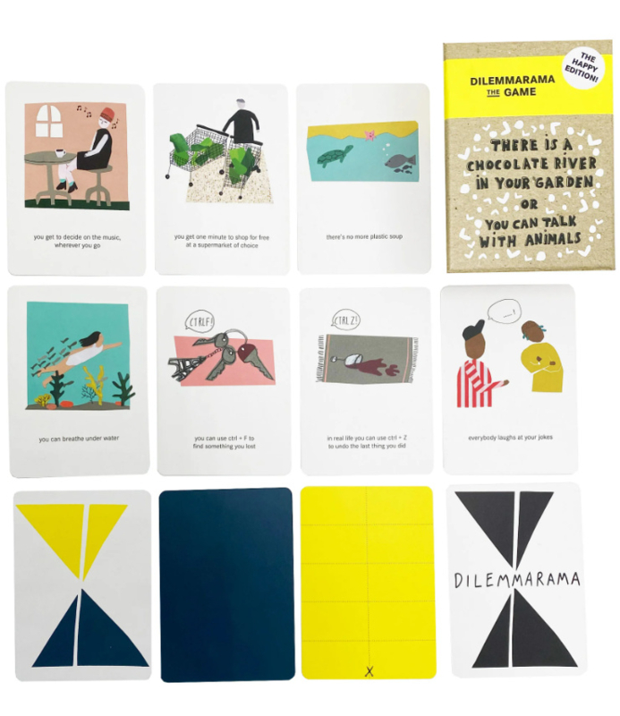 Je hebt een robot-butler óf je kunt in een dier naar keuze veranderen? je hebt een magische kraan waar alle dranken naar keuze uit komen OF als je in je vingers knipt is je hele huis schoon en opgeruimd? In dit spel is er maar één echte regel: je MOET kiezen! Dit keer tussen twee opties waar je BLIJ van wordt. Voor deze blije editie van het Dilemma op Dinsdag-spel zijn de beste positieve dilemma’s geselecteerd, die je niet alleen laten lachen, maar ook nog zorgen voor vurige discussies en duels. Er zijn twee spelopties waar je tussen kunt kiezen, omdat alles in het leven nu eenmaal een dilemma is. In het ene spel is je doel is om een zo moeilijk mogelijk dilemma voor de andere spelers op tafel te leggen en de dilemmaestro te worden. In het andere spel speel je in teams en probeer je te raden wat je teamgenoten kiezen. Zo leer je je vrienden en familie pas echt goed kennen!