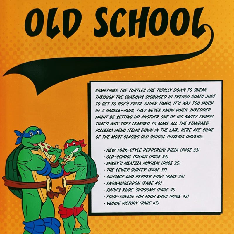 Het boek bevat 65 recepten. Van old school classics tot moderne recepten. Pizza's zijn er voor iedere gelegenheid. Ontbijtpizza, mini-pizza, party-pizza en zelfs pizza als toetje. En dat allemaal helemaal officieel met artwork van de originele tekenfilm.