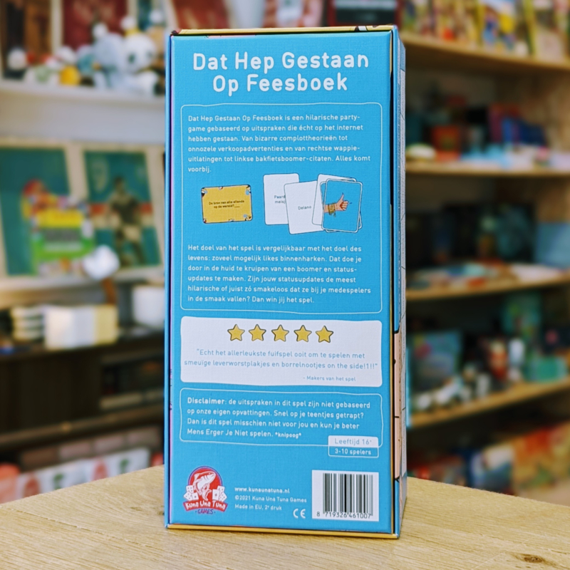 Dat hep gestaan op Feesboek, een hilarische partygame gebaseerd op uitspraken die écht op het internet hebben gestaan. Van bizarre complottheorieën tot onnozele verkoopadvertenties. Van rechtse wappie-uitlatingen tot linkse bakfietsboomer-citaten. Alles komt voorbij.