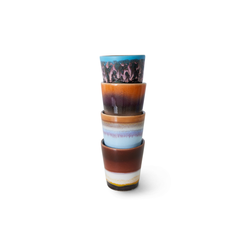 Een set van 4 keramische ristretto kopjes in verschillende kleuren. By far onze favoriete koffiekoppen. Looks zijn subtiel ouderwets, de kwaliteit is van nu. Deze set is mooi verpakt in een iconische 70's gift box.