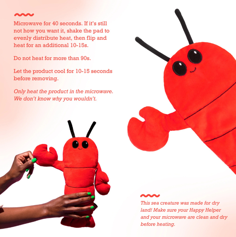 Nothing says good vibes like the Menstruation Crustacean Lobster heating pad! This heat-up, huggable lobster heating pad will be your new bestie for menstrual pain relief or general aches and pains. Microwave this magical lobster heating pad to soothe cramps or anything else that hurts—just be sure to check out the instructions for specifics. This Menstruation MVP stands tall at 14 inches, making it perfect for perching where it hurts. Featuring a gentle lavender scent, the Menstruation Crustacean soothes and comforts with aromatherapy, all while being as cute and cuddly as a crustacean can be.Makes a great gift for a sister, girlfriend, or bestie. This heat pad is also great as a travel neck pillow, or for postpartum and neck pain relief.